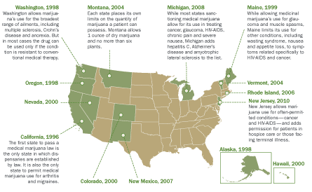 Though smoked cannabis has not been approved by the Food and Drug Administration, its use for medical purposes has been sanctioned by law in 14 states (shown in green, year given).