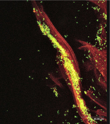 But as Barak’s work shows, salmonella cells apparently also have devices specifically for making solid attachments to plant surfaces. The latest paper from this project, in the September Molecular Plant-Microbe Interactions, details two such fasteners. The molecular gadgets help the microbes hold on to each other as well as to plant tissue. The interconnected bacterial cells form a solid biofilm, which offers protection to its members from external hazards.