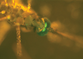 GREEN GENES. The green eyes of this Anopheles stephensi mosquito mark it as a carrier of a gene that produces a small molecule that renders its gut unfriendly to rodent-malaria parasites.