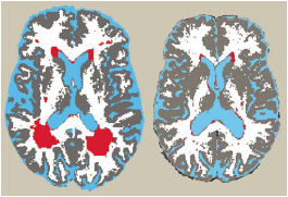 SPOTTED. Red zones highlight brain lesions—notable in scan at left and minimal in scan on right—imaged in magnetic resonance scans during a study of diet and the brain.