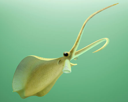 JET PROPELLED New fossils of Nectocaris pteryx (illustration shown), a species previously known only from a single, poorly preserved specimen, suggest that the creature is an early relative of today’s octopuses, squid and other cephalopods.