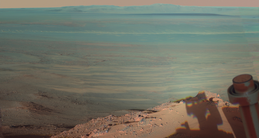 CRATER VIEW The 10-year-old Mars rover Opportunity casts a shadow over the planet’s Endeavour Crater, which holds traces of ancient water. The rover created this false-colored mosaic image in 2012 by combining pictures taken through different filters of its panoramic camera.
