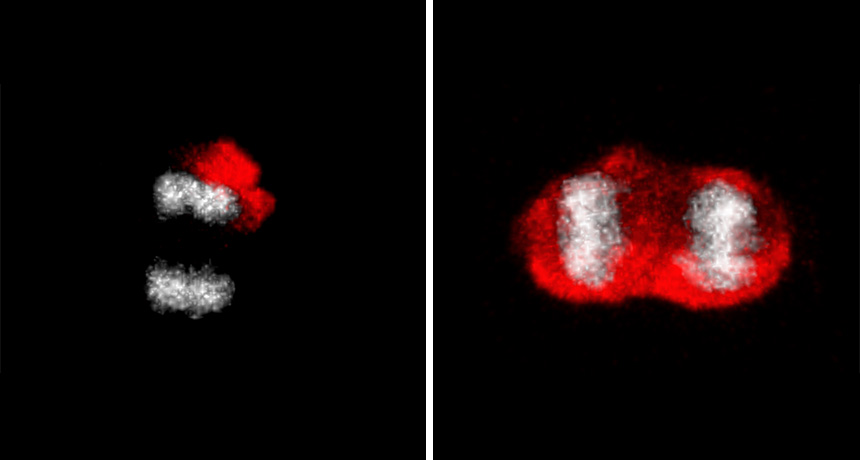 THE GREAT DIVIDE Young brain stem cells (one shown dividing, left) pack old proteins tagged with ubiquitin (red) into one daughter cell. Old cells (one shown dividing, right) lose a barrier that segregates the damaged proteins. DNA is shown in gray.
