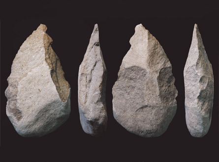 OLD AND EDGY A stone hand ax (shown from different angles), dating to 1.76 million years ago, comes from the earliest known culture to have made such implements.
