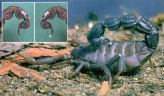 TWO STINGS IN ONE. The stinger (insets) of this South African scorpion first releases a clear droplet (left), then switches to a more complex, cloudy cocktail (right).