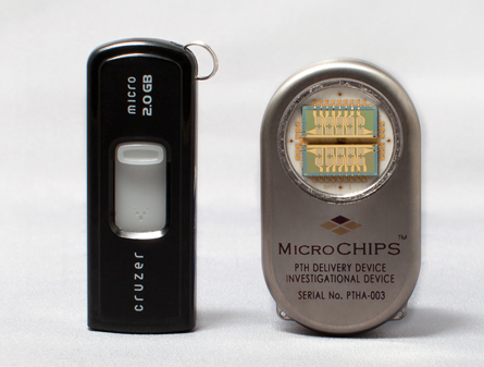 VANCOUVER — An implanted microchip that releases medication on command from wireless signals has been demonstrated in people for the first time using a drug for osteoporosis.