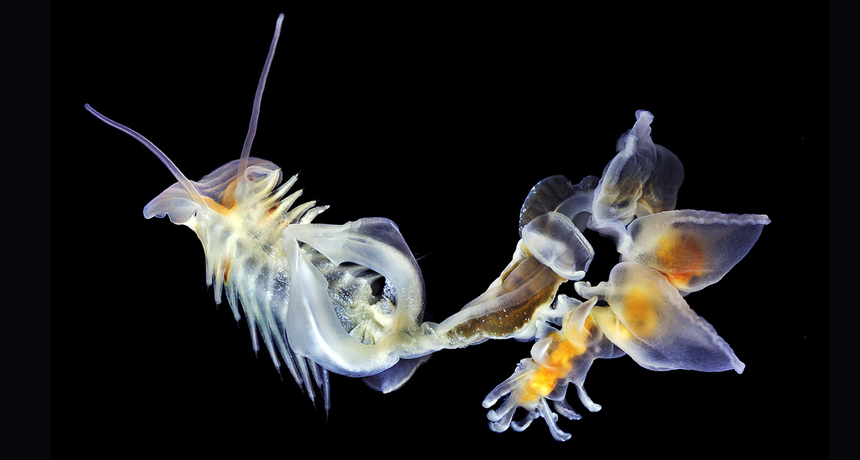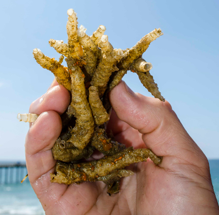 GLOW WORM Parchment worms use their filmy flaps to pump water through the tubes they build around themselves. This one has been removed from its U-shaped home.