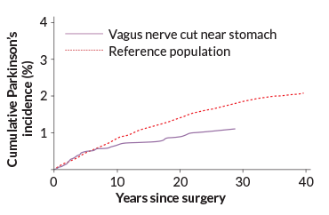 To look at this idea another way, researchers have examined what happens to Parkinson’s risk when people have a weak or missing vagus nerve connection. There was a time when doctors thought that an overly eager vagus nerve had something to do with stomach ulcers. Starting around the 1970s, many patients had the nerve clipped as an experimental means of treatment, a procedure called a vagotomy. In one of the latest studies on vagotomy and Parkinson’s, researchers examined more than 9,000 patients with vagotomies, using data from a nationwide patient registry in Sweden. Among people who had the nerve cut down low, just above the stomach, the risk of Parkinson’s began dropping five years after surgery, eventually reaching a difference of about 50 percent compared with people who hadn’t had a vagotomy, the researchers reported in 2017 in Neurology.