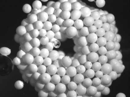 Engineers have made a gas bubble with a hole in it. Tiny beads surround a sesame-seed–size ring of air that holds its shape in air-saturated water for at least 2 weeks, says Anand Bala Subramaniam of Harvard University. Hundreds of ceramic zirconia beads at the gas-water boundary lock in the shape.