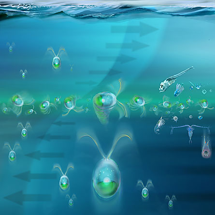 News Physics Physics could unite plankton The oceanic version of wind shear can disorient marine microorganisms and trigger formation of thin, densely populated layers By Sid Perkins February 19, 2009 at 3:13 pm - More than 2 years ago Share this:Share Share via email (Opens in new window) Email Click to share on Facebook (Opens in new window) Facebook Click to share on Reddit (Opens in new window) Reddit Click to share on X (Opens in new window) X Click to print (Opens in new window) Print Phytoplankton sometimes come together in the ocean because they can’t tell which way is up, new research suggests. TAKING A TUMBLE Phytoplankton often accumulate in thin layers below the ocean surface. The boundary between two currents could be where.