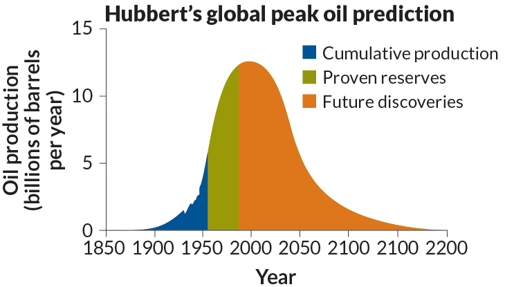 In 1956, Marion King Hubbert predicted world oil production would peak in about 2000. Production has surpassed this forecast, reaching over 30 billion barrels in 2014.