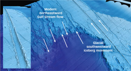 The seafloor culs-de-sac indicate that the currents driving the icebergs flowed to the southwest, opposite to prevailing currents today. At present, warm waters of the northeast-flowing Gulf Stream bathe the region, says Hill. However, she and her colleagues suggest that an offshore shift in the Gulf Stream at the height of the last ice age—when sea levels were more than 100 m lower than they are now—would have allowed glacially fed, iceberg-rich coastal currents to penetrate this far south. Hill and her colleagues presented their findings last month in San Francisco at a meeting of the American Geophysical Union.