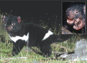 ROUGH PATCH. Tasmanian devils can spread fatal facial tumors (inset) when they fight.