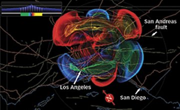 If a magnitude 7.7 earthquake struck near Los Angeles on the San Andreas fault, where would its most destructive vibrations occur? About 20 seconds after such a quake, the strongest ground motions would be in the yellow and green areas of this image.