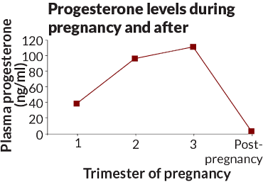 Editor’s note: This article was updated on March 13, 2018, to correct measurements on the graph, Progesterone levels during pregnancy and after. The amounts are plasma progesterone in ng/ml.