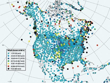 In the map above, dots other than light-and medium-blue shades mark potential wind-power areas. All that’s needed for U.S. utilities to generate as much electrical power as the nation now consumes, the researchers calculate, are around 750,000 1.5-megawatt wind turbines.
