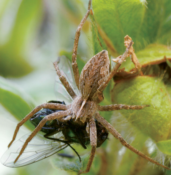 A GIFT FOR YOU Male nursery web spiders (left) present nuptial gifts in the form of insect carcasses wrapped in silk.