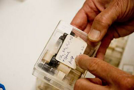 OLD DATA, NEW FINDINGS Jeffrey Bada holds original samples from Stanley Miller’s famous 1953 primordial soup experiment.
