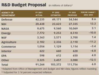 Of the $2.13 trillion in proposed federal expenditures detailed for fiscal year (FY) 2003, nearly $112 billion would go to R&D, an overall increase over FY 2002 of nearly $8.6 billion, or about 6 percent after accounting for expected inflation. The Department of Defense (DOD) and the National Institutes of Health (NIH) reap the lions share of the increase, a reflection of the new emphasis on national security, according to Bushs chief science advisor, John H. Marburger, who is director of the Office of Science and Technology Policy.
