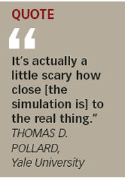 During cell division, a ring of proteins forms around a cell’s “equator” and then contracts to pinch the cell in half. These proteins arrange themselves into an orderly ring by a random process of searching, grabbing, and pulling each other, scientists have discovered.