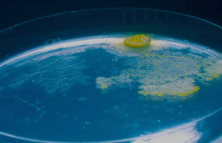 MAKING TRACKS As a slime mold extends its tendrils across the growth medium of a petri dish, it avoids an already explored region (left) that was crisscrossed in previous journeys.