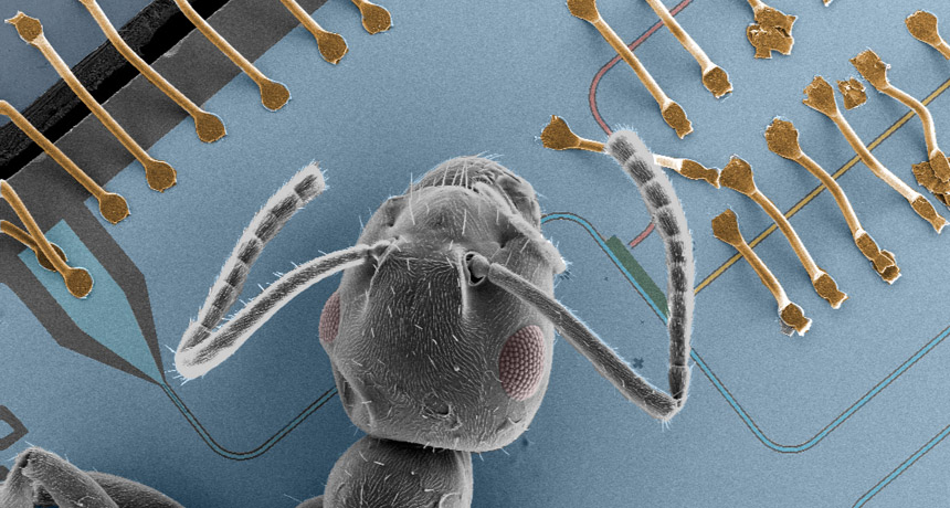 QUANTUM VIEW An ant provides scale in this false-color electron micrograph of the first solid-state device capable of quantum teleportation.