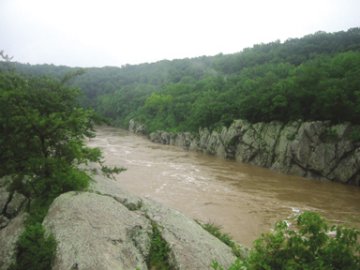 HIGH WATER. Most of the erosion along the Potomac River’s Mather Gorge results from large floods, such as this one in June 2003 just upstream of Washington, D.C.