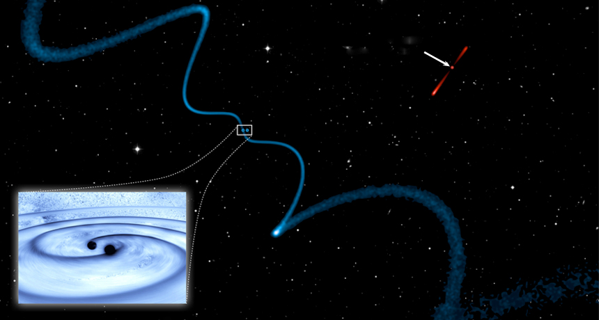 THREE’S A CROWD Three supermassive black holes, seen in an artist’s illustration, include two only 450 light-years apart (blue), with electron jets streaming out in spirals. The third black hole (red) sits 24,000 light-years away and produces straight jets.