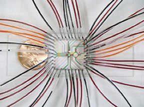 HOT CHIP. Food dyes illustrate tunnels, pumps, and valves in this microreactor, which makes nanogram amounts of a PET probe. Penny shows scale.