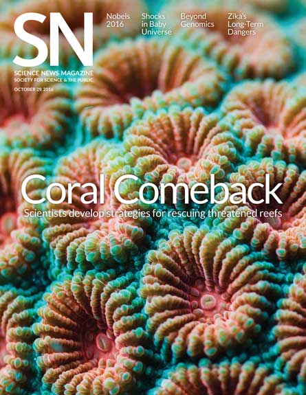 Algae that provide nutrients to corals turn toxic and lead the corals to “bleach” and sometimes die when ocean temperatures spike. Researchers are seeding damaged reefs with baby corals and breeding heat-tolerant corals to help these imperiled marine animals, Amy McDermott reported in “Rebuilding reefs” (SN: 10/29/16, p.
