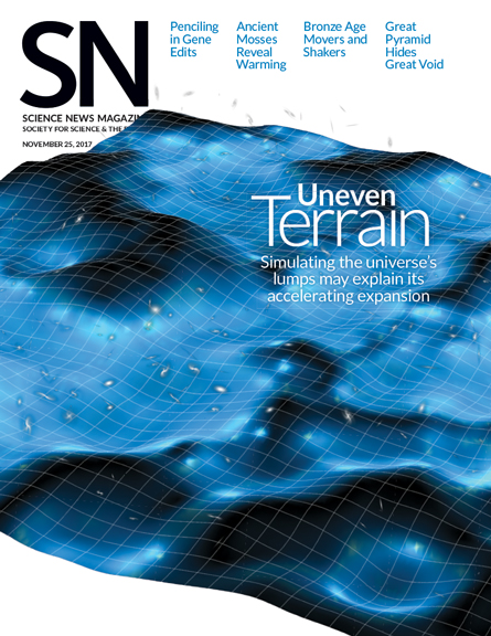 Some cosmologists hope to explain the universe’s accelerating expansion by fully accounting for the universe’s lumpiness, Emily Conover reported in “Simulating the universe using Einstein’s theory of gravity may solve cosmic puzzles” (SN: 11/25/17, p.