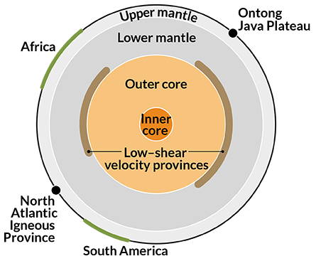 Geophysicists have identified two large “blobs” in the deep mantle, called large low-shear velocity provinces. Those blobs “could be candidates” for the remnants of the ancient mantle, Rizo says.