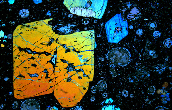 ROCKY REMAINS Volcanic rocks in the Cook Islands have revealed that Earth’s crust can survive in the mantle for billions of years, as evidenced by sulfur isotopes trapped within crystals of the mineral olivine (blue, in this light-filtered image).