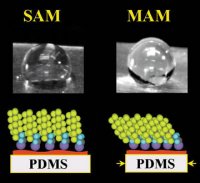 Molecules naturally aligned on the polymer PDMS are loosely packed (bottom left). Stretching PDMS, attaching molecules, and then releasing the tension creates a denser arrangement (bottom right) that repels water (top) better than natural packing does. Genzer/N.C. State Univ.