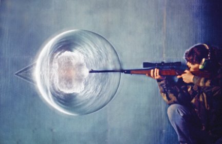 Recently, the Penn State team has taken remarkable pictures of firearms discharging that show much more than typical schlieren images do. Whereas the old method typically showed shock waves from the bullet and in the immediate vicinity of a muzzle, the newer, wide-view schlieren pictures also reveal shock waves and evidence of hot combustion gases extending for several meters.