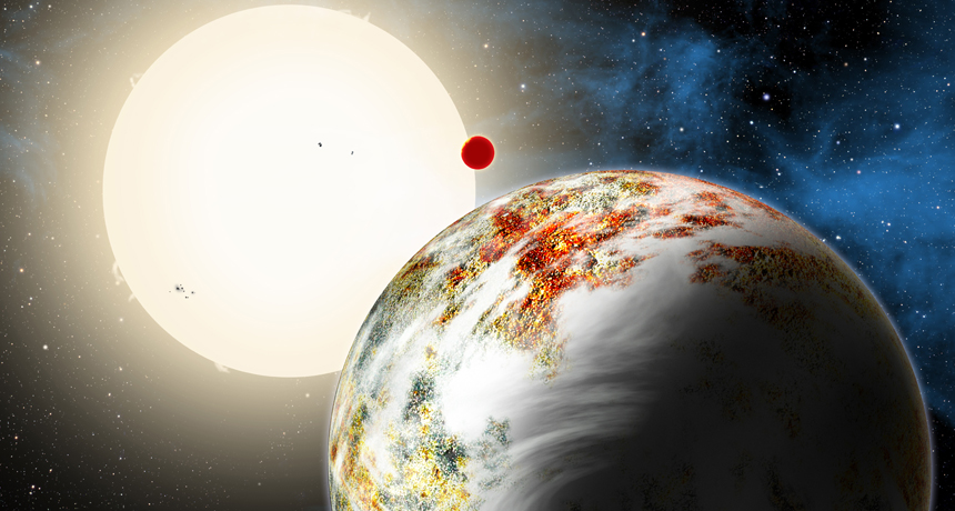 PLUMP PLANET Kepler-10c, a rocky planet 17 times as massive as Earth, orbits its sun in an artist’s illustration. Its sister planet, Kepler-10b, is in the background, sitting much closer to the star.