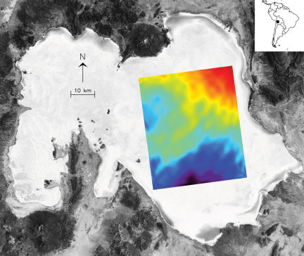 NOT FLAT AFTER ALL. A field survey of Bolivia’s Salar de Uyuni, the world’s largest salt flat, found a broad ridge (green area running southwest to northeast) flanked by shallow depressions (dark-blue areas).