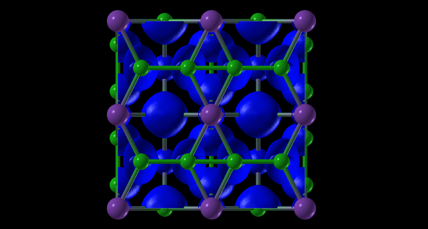 SALT GONE WILD Experiments using extreme conditions reveal that common table salt, NaCl, can form exotic compounds, such as NaCl3. In this illustration, purple represents sodium, green represents chlorine and blue represents electron clouds.