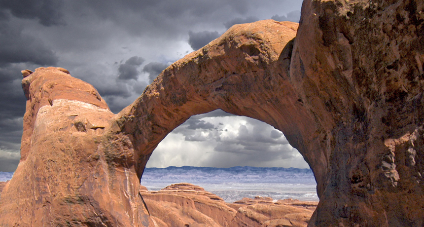 SAND SCULPTURE Sandstone arches such as the 22-meter-long Double O Arch in Utah’s Arches National Park form without chemical glue. Instead, downward forces cause sand grains to interlock.