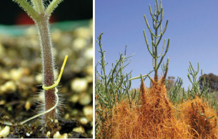 CREEP. The tendril of a young dodder plant stretches out to entwine a tomato seedling (left). A dodder tangle steals nutrients and water from a glasswort (right). Runyon/C. Purrington