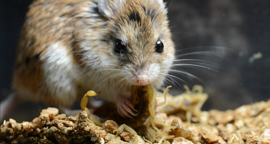 NO PAIN An Arizona bark scorpion makes a tasty lunch for the carnivorous southern grasshopper mouse. Proteins in the mouse’s nerves prevent pain signals triggered by the scorpion’s sting from reaching the brain.