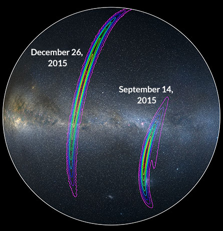 The two black holes in the most recent detection were about eight and 14 times the mass of the sun and were located roughly 1.4 billion light-years from Earth, the scientists estimate. When the pair fused, they formed one bloated black hole with a mass 21 times that of the sun. One sun’s worth of mass was converted into energy and carried away by the gravitational waves, LIGO scientists announced June 15 in San Diego during a meeting of the American Astronomical Society.
