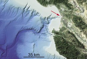 The submarine Monterey Canyon (dark blue) cuts through the continental shelf off California and extends nearly to the mouth of the Salinas River (arrow).