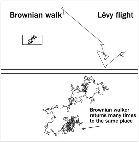 WALK THIS WAY An animal moving according to random, or Brownian, motion (top left and bottom) often returns to the same place it started.