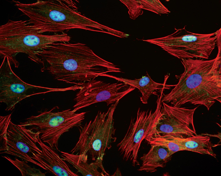 Despite being kept in the same lab conditions, these human colon cells make differing amounts of the protein beta-catenin (green) in their nuclei (blue).