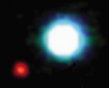 POSSIBLE PLANET. Near-infrared image of a candidate extrasolar planet (red) that may be orbiting a brown dwarf. The dwarf lies 230 light-years from Earth. ESO