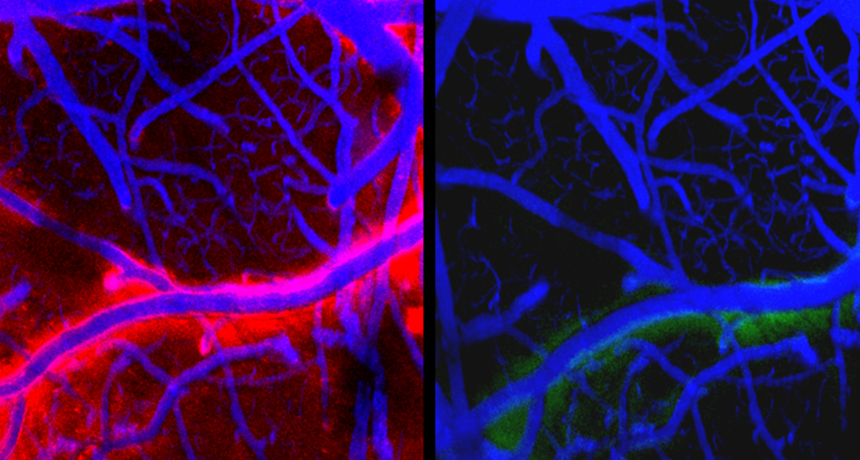 WIDE ASLEEP Colored tracers penetrate more deeply into a mouse’s brain when it’s asleep (left, red tracer) than awake (right, green tracer). The finding indicates that channels between brain cells open up during sleep and allow cerebrospinal fluid to wash debris out of the brain. Blood vessels are shown in blue.