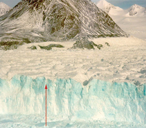 COLD CLIFF. A fresh ice terrace (arrow), one of many rimming the edge of Antarctica’s Sjögren Glacier, indicates that the ice stream’s center (foreground) is surging coastward and thinning much faster than the sluggish ice along its edges.