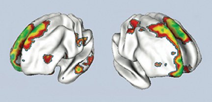 THICKHEADED. Colored areas of these brain maps highlight regions, mostly located toward the front of the brain, where superior-IQ children developed especially thick cortical tissue by about age 12, compared with average-IQ kids.
