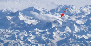 DRIFTING DOWNWIND. Hurricane-force winds lofted a 20-kilometer-long snow plume from Mount Everest (arrow) on Jan. 28, just days after a huge snowstorm there.